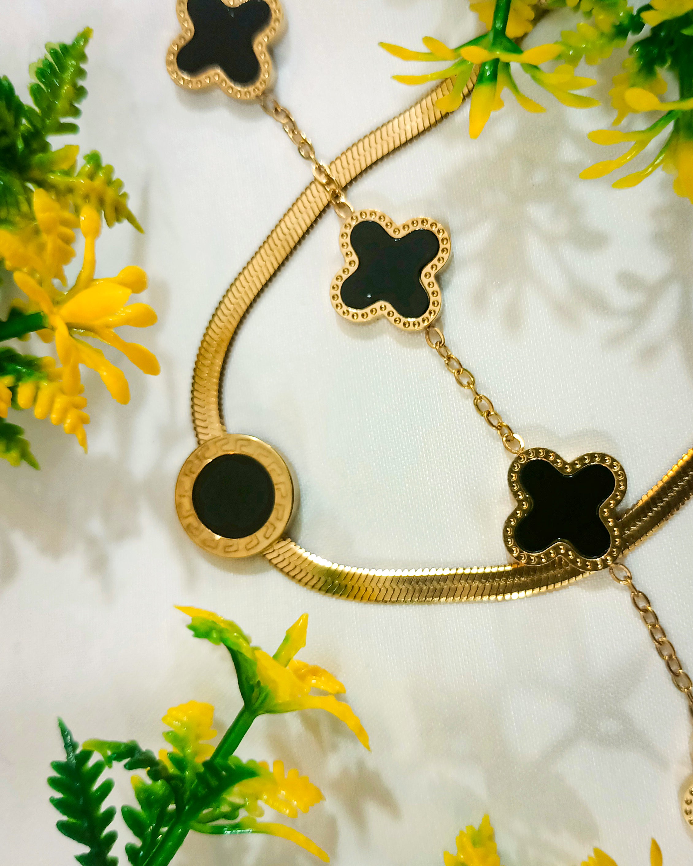 Refined and contemporary, the Ebon Luxe Set combines bold black clover motifs with a radiant gold finish for a truly luxurious appeal. Designed to balance elegance with modern edge, it’s the ultimate statement piece for your collection.
