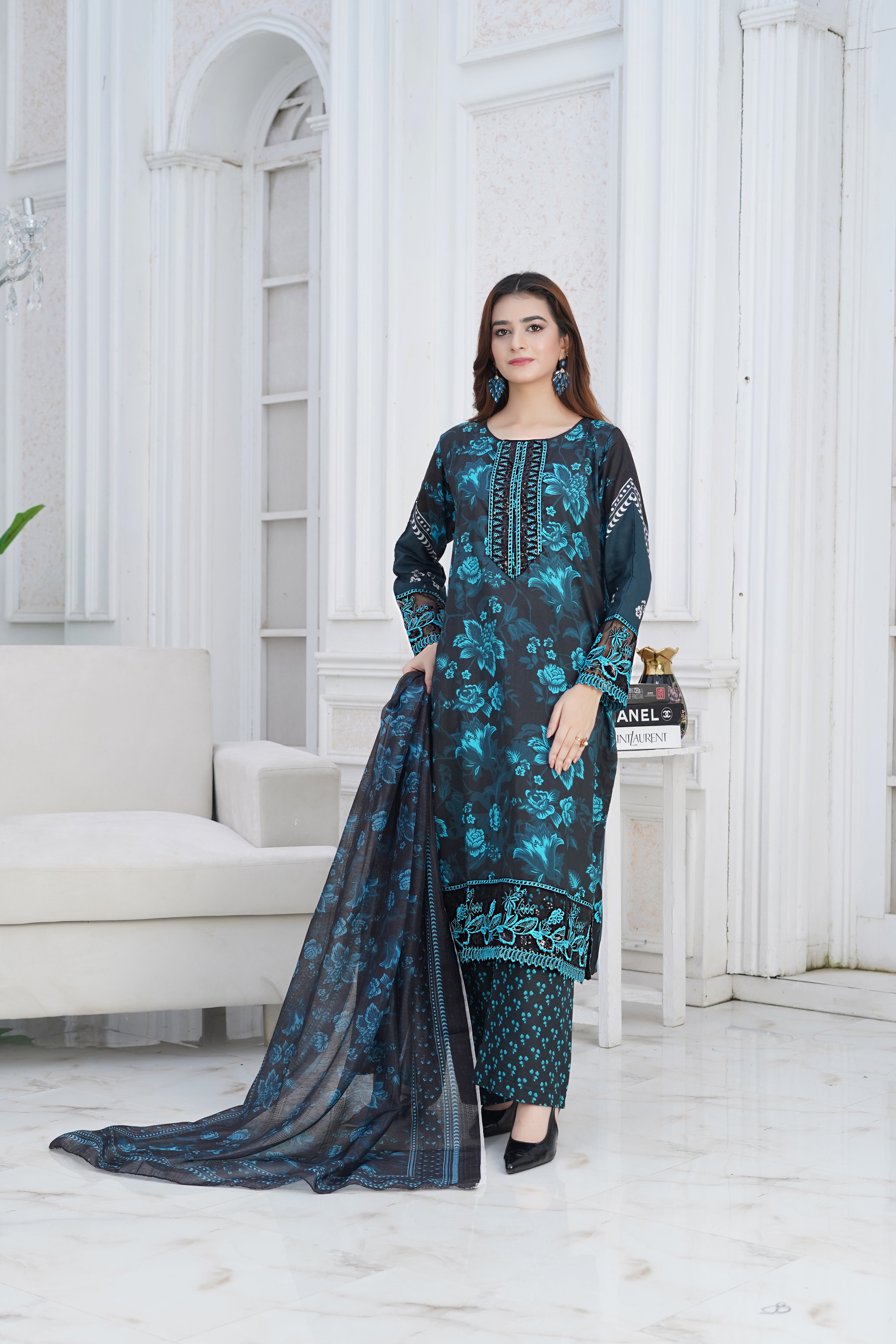 Our fabric is crafted from 100% pure cotton lawn, celebrated for its lightweight, breathable, and luxuriously soft nature. With its fine, smooth texture and graceful drape, this fabric offers effortless elegance while ensuring all-day comfort. Designed to keep you cool and fresh in warm weather, it blends timeless sophistication with natural ease, making it a perfect choice for both everyday wear and special occasions.
