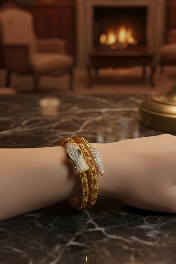 Refined and minimal, the features two gold-plated bracelets accented with sleek snake face motifs. Designed for versatile styling, they’re perfect worn solo for understated elegance or stacked together for a modern layered look.