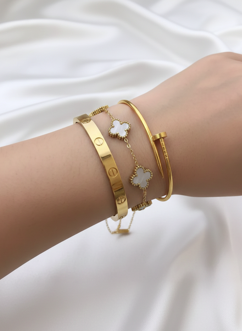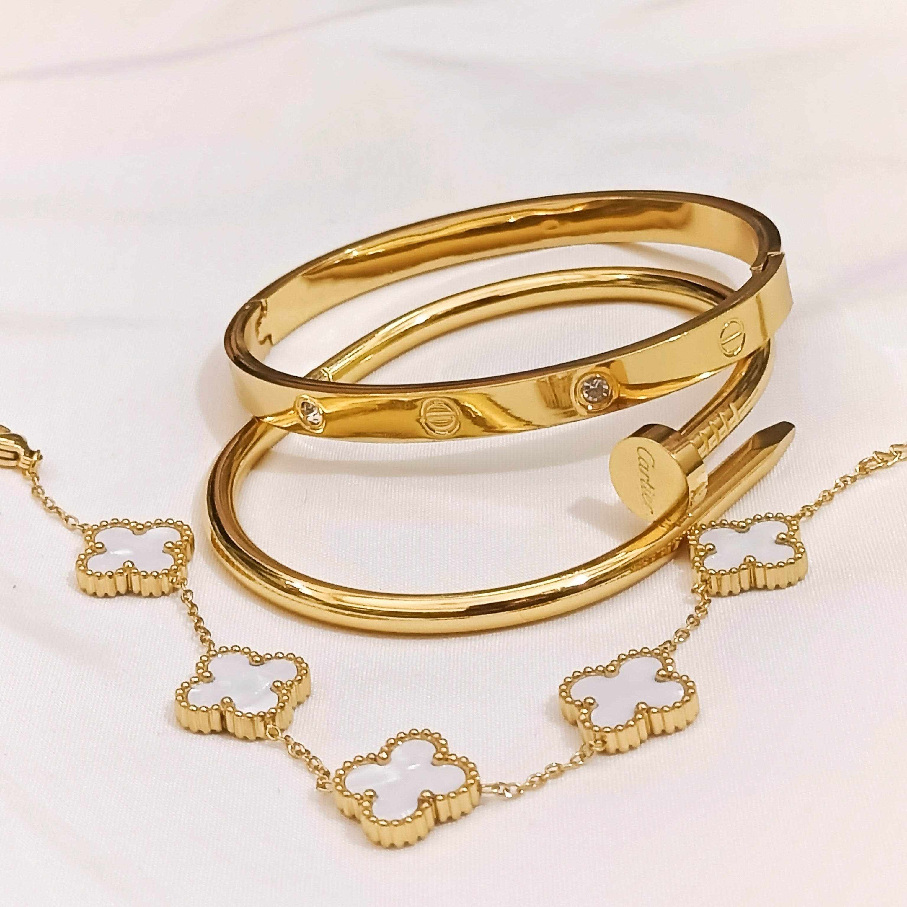 Bring elegance and versatility to your collection with this premium 3-piece bracelet set. Featuring the bold Nail Bangle, the timeless Cartier Cuff, and the delicate Clover-Chain Bracelet, this set is designed to complement every style — from everyday looks to special occasions.