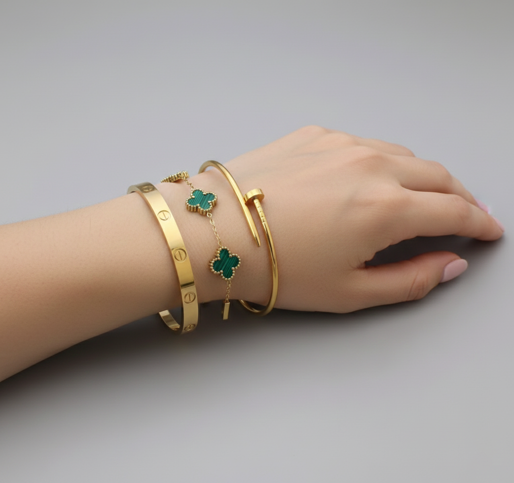 Elevate your accessory collection with this luxurious 3-piece bracelet set, blending bold, classic, and feminine styles. The sculptural Nail Bangle, the timeless Cartier Cuff, and the delicate Clover-Chain Bracelet together create a versatile combination — perfect for both casual and formal looks.