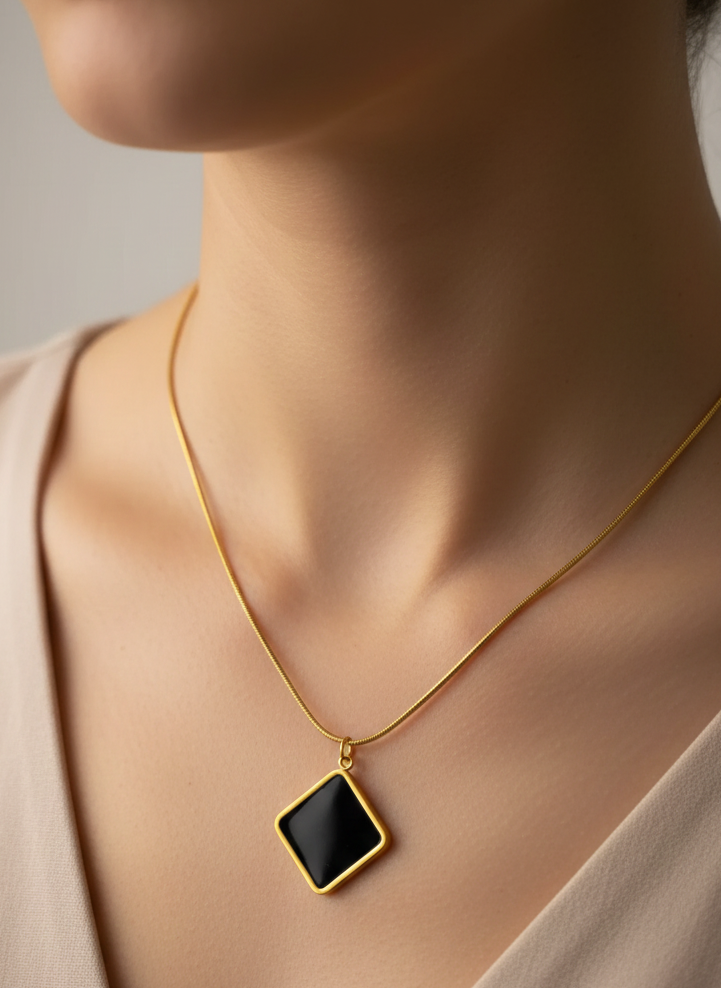 Make a bold statement with this sleek pendant necklace, a design admired by fashion enthusiasts worldwide. With its striking black centerpiece framed in flawless gold, this piece radiates effortless sophistication. Built to withstand daily wear, it’s water, heat, and sweat-proof — making it the perfect unisex accessory for both everyday style and special occasions.